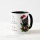 On this mug, a bewildered looking black cat is tangled in a string of Christmas tree lights. The cat wears a red and white Santa Claus hat. The image is printed twice on the mug, with text fields between the images. Currently the text says "Dear Santa, Define NAUGHTY" and "Merry Christmas". You may easily change the text to anything else you'd like, and personalize it, also. Cute for kids and adults, especially if there's a mischievous cat in the house!