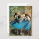 Degas Blue Dancers postcard. Oil painting from 1880s. French painter Edgar Degas was one of the great impressionists of his generation. Degas’ Ballet paintings are famous for their sense of grace, motion and subtle color. Blue Dancers is one of the most beloved Degas paintings and features pretty ballerinas huddled together fixing their hair and dresses. A great gift for fans of Degas, Impressionism, Ballet and dance paintings.