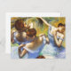 Degas Blue Dancers postcard. Oil painting on canvas from 1889. Degas is famous for his ballet paintings, and Blue Dancers is one of his most celebrated works. Three ballerinas dance in blue tutus with flowers in their hair waiting to come on stage. A great gift for fans of Edgar Degas, ballerinas, dance, ballet, and French impressionism.