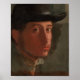 In this self-portrait a young Edgar Degas turns his head to look out at the spectator. He wears casual clothes, including an open collar and broad brimmed hat. The informal, extreme close-up view of Degas's face and his impassive, almost sullen expression echo the unpretentiousness of his clothing. The small-scale, informal presentation and lightness of touch emphasize the intimacy of this image and the still-tentative character of the young artist.