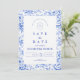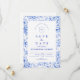 An elegant blue and white chinoiserie design inspired by classic Delft porcelain patterns. The intricate floral border surrounds a clean central panel, creating a refined and timeless look for sophisticated wedding celebrations. Delicate European toile-style artwork combined with crisp navy typography gives the design a heritage aesthetic reminiscent of fine porcelain and vintage stationery. Perfect for couples planning a classic blue and white wedding theme with traditional elegance.