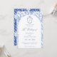 Delft blue floral wedding invitation card, designed in a refined blend of chinoiserie and French toile de Jouy style. The soft botanical illustrations frame an arched layout featuring an elegant wedding crest monogram, perfect for couples who love vintage, historic, and European-inspired aesthetics. Classic script typography pairs beautifully with the ceramic-blue palette, making this design an effortless nod to the tradition of “something blue.” Fully customizable with your names, date, and location, it’s an exquisite choice for any romantic or sophisticated wedding theme.