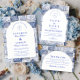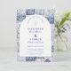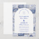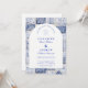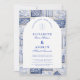A timeless blue and white design inspired by classic Delft porcelain and French toile patterns. The patchwork tile border combines delicate florals, stripes, and ornamental motifs that evoke vintage European ceramics. A soft arched panel in the center keeps the layout refined and elegant while allowing the details of the porcelain-inspired pattern to frame the celebration beautifully. Perfect for couples planning a sophisticated blue and white wedding with traditional European charm.