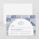 A timeless blue and white design inspired by classic Delft porcelain and French toile patterns. The patchwork tile border combines delicate florals, stripes, and ornamental motifs that evoke vintage European ceramics. A soft arched panel in the center keeps the layout refined and elegant while allowing the details of the porcelain-inspired pattern to frame the celebration beautifully. Perfect for couples planning a sophisticated blue and white wedding with traditional European charm.