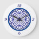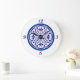 A unique wall clock with a blue vintage design with blue numbers on a white background, with numbers at 12, 3, 6, and 9.