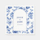 Featuring the couple’s names and wedding date within an elegant arch frame. The intricate blue and white floral design, inspired by traditional Dutch Delftware, gracefully surrounds the arch, creating a sophisticated and timeless look. Perfect for weddings with a vintage or refined theme, these custom napkins offer both beauty and practicality, making them a memorable addition to your special day. The ornate design brings a touch of luxury, ensuring your reception feels both stylish and personal.