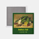 This magnet can be used as a promotional handout to advertise a delicatessen. Displayed are cucumbers, pickling spices, hot pepper, dill and garlic: all the ingredients for a fine dill pickle! The text reads: Bubba's Deli and the phone number, but can be customized to fit your own business, or just removed.