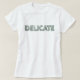 Embrace a look of refined fragility with this unique women's white t-shirt. The word "DELICATE" is beautifully rendered in a sans-serif font, featuring a stunningly realistic cracked glass texture. The letters, transparent with subtle greenish-tinged edges and intricate dark green/grey cracks, create a striking visual. A gentle drop shadow adds a touch of three-dimensional depth, enhancing its breakable, elegant appeal. This design is more than just a word; it's a whisper of caution and a reminder of the gentle strength and precious nature that deserves to be handled with care. Perfect for those who appreciate subtle yet powerful statements.