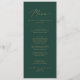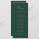 This delicate gold and green wedding dinner menu card is perfect for a modern wedding. The romantic minimalist design features lovely and elegant champagne golden yellow typography on an emerald green background with a clean and simple look. This menu can be used for a wedding reception, rehearsal dinner, or any event.
