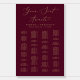 This delicate gold and burgundy your seat awaits seating chart foam board is perfect for a modern wedding. This sign can be used to organize your guests alphabetically or by table number by changing the names of the headings. The romantic minimalist design features lovely and elegant champagne golden yellow typography on a burgundy red background with a clean and simple look. This wedding sign includes enough room for up to about 120 guests. Make room for more (or less) guests by clicking the "customize" button and decrease or increase the size of the font. In addition to the placement of each guest, personalize this sign with the names of the bride and groom and the wedding date.