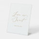 This delicate gold calligraphy love is sweet wedding pedestal sign is perfect for a modern wedding. The romantic minimalist design features lovely and elegant champagne golden yellow typography on a white background with a clean and simple look.
