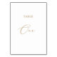 This delicate gold calligraphy table one table number is perfect for a modern wedding. The romantic minimalist design features lovely and elegant champagne golden yellow typography on a white background with a clean and simple look. The card prints on the front and back (double-sided). Other table numbers in the collection are sold separately.