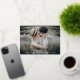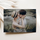 Stylish and elegant save the date card featuring your horizontal engagement photo with "Save The Date" displayed in a modern gold foil script. Personalize the gold foil save the date card by adding your names, wedding date, and city/state of your wedding venue. The reverse side of the card features a sage green background.