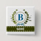 A delicate ivy wreath with a blue striped bow is layered over a fresh white background. Wedding appropriate design features the monogram "B" in blue. Button can be personalized with any name over the green ribbon banner. Design tip: For the font shown here, use all caps for the name.
