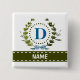 A delicate ivy wreath with a blue striped bow is layered over a fresh white background. Wedding appropriate design features the monogram "D" in blue. Button can be personalized with any name over the green ribbon banner. Design tip: For the font shown here, use all caps for the name.