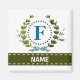 A delicate ivy wreath with a blue striped bow is layered over a fresh white background. Wedding appropriate design features the monogram "F" in blue. Magnet can be personalized with any name over the green ribbon banner. Design tip: For the font shown here, use all caps for the name.