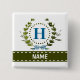 A delicate ivy wreath with a blue striped bow is layered over a fresh white background. Wedding appropriate design features the monogram "H" in blue. Button can be personalized with any name over the green ribbon banner. Design tip: For the font shown here, use all caps for the name.