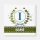 A delicate ivy wreath with a blue striped bow is layered over a fresh white background. Wedding appropriate design features the monogram "I" in blue. Magnet can be personalized with any name over the green ribbon banner. Design tip: For the font shown here, use all caps for the name.