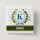 A delicate ivy wreath with a blue striped bow is layered over a fresh white background. Wedding appropriate design features the monogram "K" in blue. Button can be personalized with any name over the green ribbon banner. Design tip: For the font shown here, use all caps for the name.