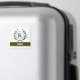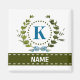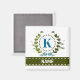 A delicate ivy wreath with a blue striped bow is layered over a fresh white background. Wedding appropriate design features the monogram "K" in blue. Magnet can be personalized with any name over the green ribbon banner. Design tip: For the font shown here, use all caps for the name.
