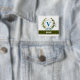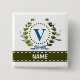 A delicate ivy wreath with a blue striped bow is layered over a fresh white background. Wedding appropriate design features the monogram "V" in blue. Button can be personalized with any name over the green ribbon banner. Design tip: For the font shown here, use all caps for the name.