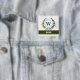 A delicate ivy wreath with a blue striped bow is layered over a fresh white background. Wedding appropriate design features the monogram "W" in blue. Button can be personalized with any name over the green ribbon banner. Design tip: For the font shown here, use all caps for the name.