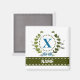 A delicate ivy wreath with a blue striped bow is layered over a fresh white background. Wedding appropriate design features the monogram "X" in blue. Magnet can be personalized with any name over the green ribbon banner. Design tip: For the font shown here, use all caps for the name.