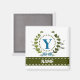 A delicate ivy wreath with a blue striped bow is layered over a fresh white background. Wedding appropriate design features the monogram "Y" in blue. Magnet can be personalized with any name over the green ribbon banner. Design tip: For the font shown here, use all caps for the name.