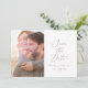 This delicate rose gold calligraphy photo save the date card is perfect for a modern wedding. The romantic minimalist design features lovely and elegant dusty rose blush pink typography on a white background with a clean and simple look.