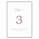 This delicate rose gold calligraphy table number is perfect for a modern wedding. The romantic minimalist design features lovely and elegant dusty rose blush pink typography on a white background with a clean and simple look. The card prints on the front and back (double-sided). Items are printed exactly as they appear on your screen when you add to cart, so personalize and add each table number that you need to your cart individually.