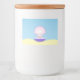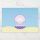 Pink and purple seashell with a beautiful pearl, beach landscape, blue sky, yellow sand.