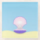 Pink and purple seashell with a beautiful pearl, beach landscape, blue sky, yellow sand.