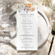 Elegant floral wedding menu featuring a bouquet of watercolor flowers and foliage in shades of peach, ivory, orange, blush pink, purple, yellow, and green. Personalize the spring floral wedding menus with your names, wedding date, and menu details. The stunning floral wedding menu is perfect for spring and summer garden weddings.