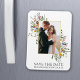 Modern Watercolor Wildflower Wedding Wedding Engagement Announcement Save The Date Magnet includes yellow, pink, purple, dusty blue and white wild flowers, eucalyptus leaves, sage green leaves and other botanical greenery on a gold frame. Couple Photo.