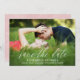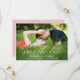 Elegant photo save the date card with a delicate calligraphy script. Add your names, wedding date, and other info, as well as a photo of the two of you. The back features a leaf pattern in coral red and white.