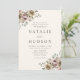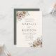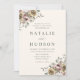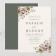 Elegant winter floral wedding invitations featuring your wedding details displayed in dark green lettering with floral bouquets at the corners on an ivory background. The winter flowers feature a color palette of dusty rose, light pink, ivory, and soft golden yellow with eucalyptus leaves and winter foliage in shades of sage green and rich forest green.