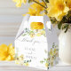 Delicate watercolor yellow flowers decorate this lovely summer afternoon wedding favor box. The garden wedding box is accented with a gentle sage green rectangle border and botanical leaves underneath the elegant sunny peonies. Floral and light, perfect for an outdoor ceremony.