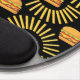 Vibrant and fun pattern with stylized hamburgers surrounded by radiant french fries.