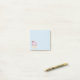 small square sticky notes with an illustration of a delicious cupcake with pink swirls and a berry with leaves nestled in the frosting. Set on a light blue background.