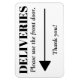 This handy flexible magnet has a white background that can attach to and blend in with a white metal door. The customizable black text says, "DELIVERIES - Please us the front door" with a left-facing arrow in black with the words, "Thank you!" below. You can edit the arrow direction by using the "Edit using design tool" to take you to the layers section where you can then move the arrowhead to the opposite side and rotate it.
