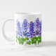 Original fine art design of blue and purple Delphinium or Larkspur flowers by artist Carolyn McFann of Two Purring Cats Studio on a quality mug for floral art fans.