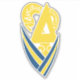 This bold design prominently features the official logo of the Delta Upsilon Fraternity, rendered in striking yellow and deep blue. The central element is a large, stylized Delta (Δ) symbol, which incorporates an inner triangle. Curved elements adorned with Greek text gracefully frame the upper portion of the Delta, while sharp, pointed, wing-like accents in yellow and blue complete the lower section. This impactful design embodies the contemporary spirit, strength, and foundational principles of Delta Upsilon, serving as a powerful and recognizable identifier for members and supporters.