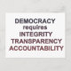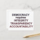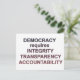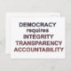 Reach out to voters or others with "Democracy requires Integrity Accountability Transparency" postcard. Blue/orange ombré letters on white background. Address side is blank for your message.