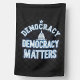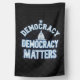 The design features the word "Democracy" in bold, stylized letters at the top, with a star above it. Below, there is an image of a dome-shaped building, resembling a capitol building, with the word "MATTERS" in a similar bold font underneath. The text is illuminated with a neon effect, set against a black checkered background.