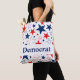 This medium size tote bag is shown with a patriotic stars print with Democrat text.