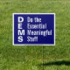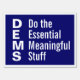 Dems Do the Essential Meaningful Stuff, Vote Blue. The reminder that D E M S, Dems for Democrats, stand for doing the essential, meaningful and not glamorous stuff important to governing and to our lives. It's Biden's Administration that has reduced the price of insulin and it is Biden's Administration that passed an infrastructure bill that invests in our country's future. Meanwhile, across the country at the local, state, and national level, Republicans spread fear and hate, do nothing to improve the lives of working people and actively undermine your children's education and your right and ability to vote. Life is short, why would we want to go back to having to spend all our political time having to figure out how to keep that orange man from being a dictator and getting absolutely nothing done to help our people and this country? In a second term, he has told us he will be worse, and he will be worse. The Supreme Court has made clear that what few checks and balances held during the first term will not hold during a second term as that orange man rampages over democracy like an injured animal because he's mad he's being held accountable for his own actions. Why make our lives worse with more of that? No thanks. Vote blue, up and down the ballot. Design description: The front is a horizontal design with large white sans serif letters on a midnight blue background framed with a white rectangle. The letters D, E, M, and S run vertically on the left-hand side. In a second column on the right hand side are the words "Do the essential meaningful stuff," with each word lined up with the corresponding letter in the word "Dems." The effect is for you to associate in your brain that "D is for Do the," "E is for essential," "M is for meaningful," and "S is for stuff."