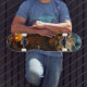 The skateboard features a peculiar and striking design, representing a cat creature with a demonic touch and associated with the Halloween theme. The figure of the cat is decorated in such a way that it incorporates elements such as a pumpkin, suggesting a fusion between the traditional image of a cat and the aesthetic of this holiday. The combination of demonic appearance and the presence of pumpkin add a festive and fantastic element to the skateboard design, creating a unique and visually shocking image.