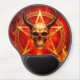 This captivating piece of artwork features a menacing evil demon skull, complete with intricate horns. The skull is prominently placed in front of a fiery pentagram, with flames rising dramatically in the background.