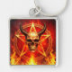 This captivating piece of artwork features a menacing evil demon skull, complete with intricate horns. The skull is prominently placed in front of a fiery pentagram, with flames rising dramatically in the background.