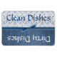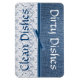 Practical and stylish clean / dirty dishwasher magnet done in a blue denim look, on one end, and an white lace look, on the opposite end of the magnet. Graphics of a blue ribbon decorates the middle of the magnet and blue and white text reads, Clean Dishes and Dirty Dishes, on the other end. Great little gift idea for anyone.